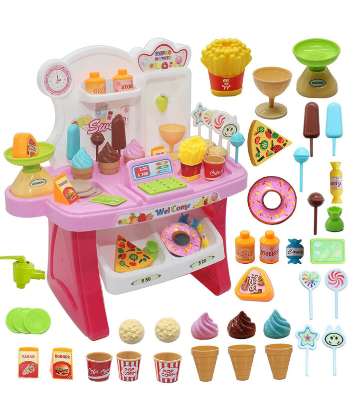 • Includes shopping cart, counter, groceries, play money, and more